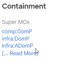 Dans certaines situations, il peut être nécessaire de lister les objets qui en composent un autre (les objets enfants), ce que ne permettent pas de faire les deux méthodes précédentes. Par exemple avec les domaines VMM, certains objets représente une association entre deux autres objets : si on souhaite associer un VLAN pool (fvnsVlanInstP) à un domaine VMM (vmmDomP), on doit créer un troisième objet qui décrit cette relation (infraRsVlanNs).